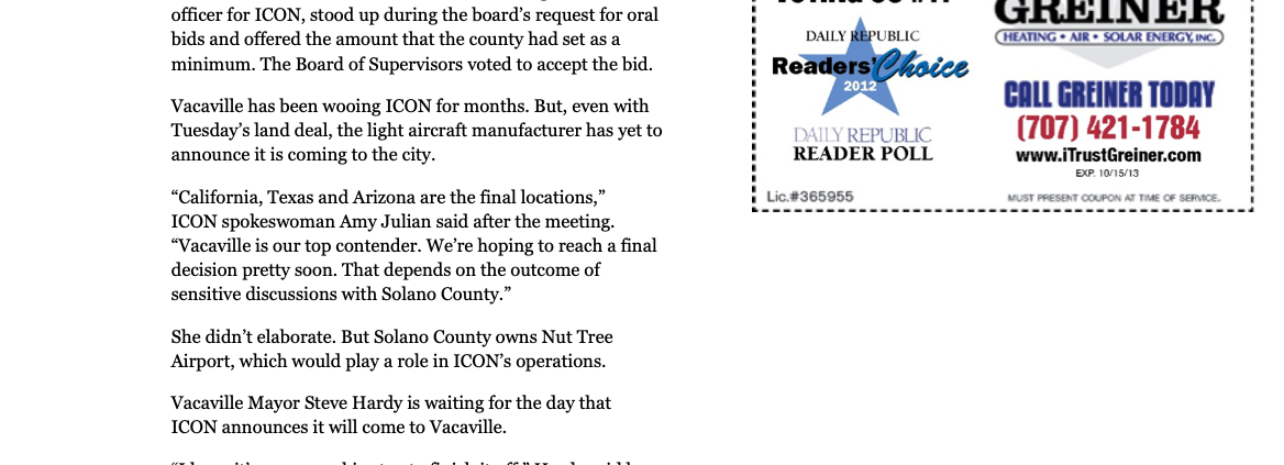 admin2013-09-26 00:00:052022-09-19 16:34:06Daily Republic- Vacaville Council Approves Agreement With Aircraft Maker ICON